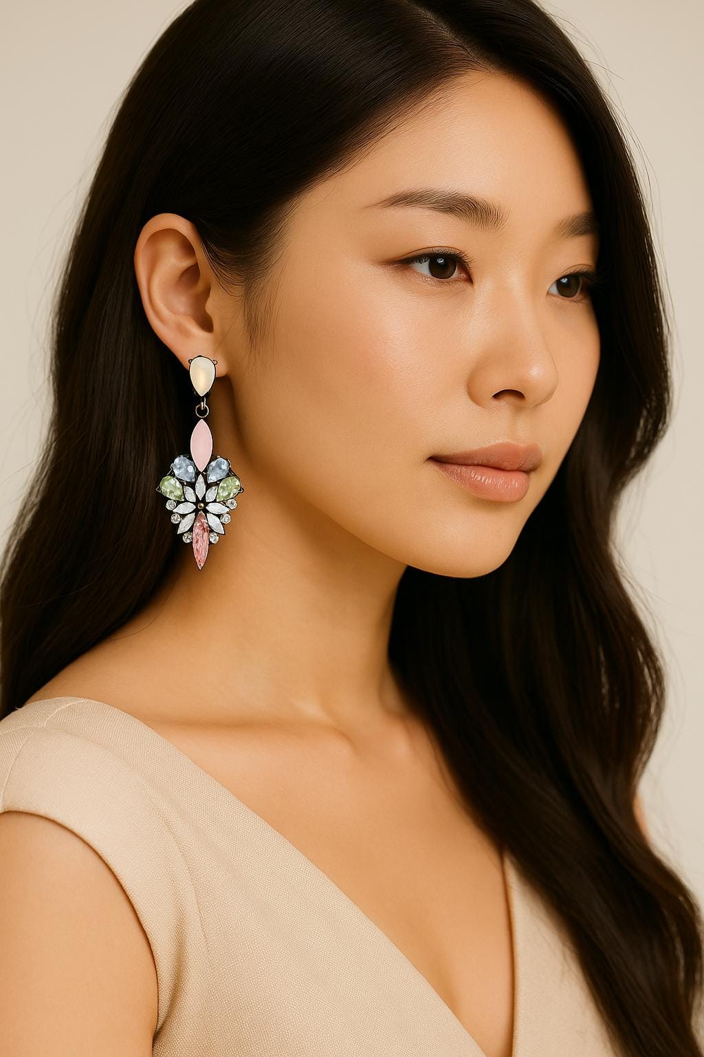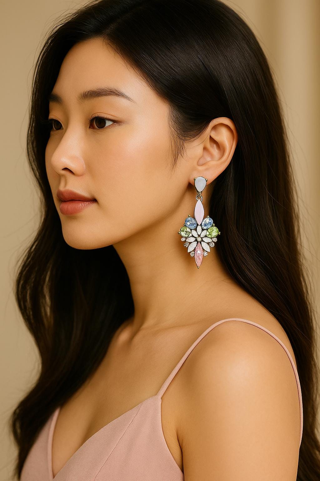 플로럴 컬러 하모니: 소프트 핑크, 민트 그린, 스카이 블루, 오팔 화이트가 조화롭게 어우러져 투명하고 에테리얼(ethereal)한 광채를 완성합니다.